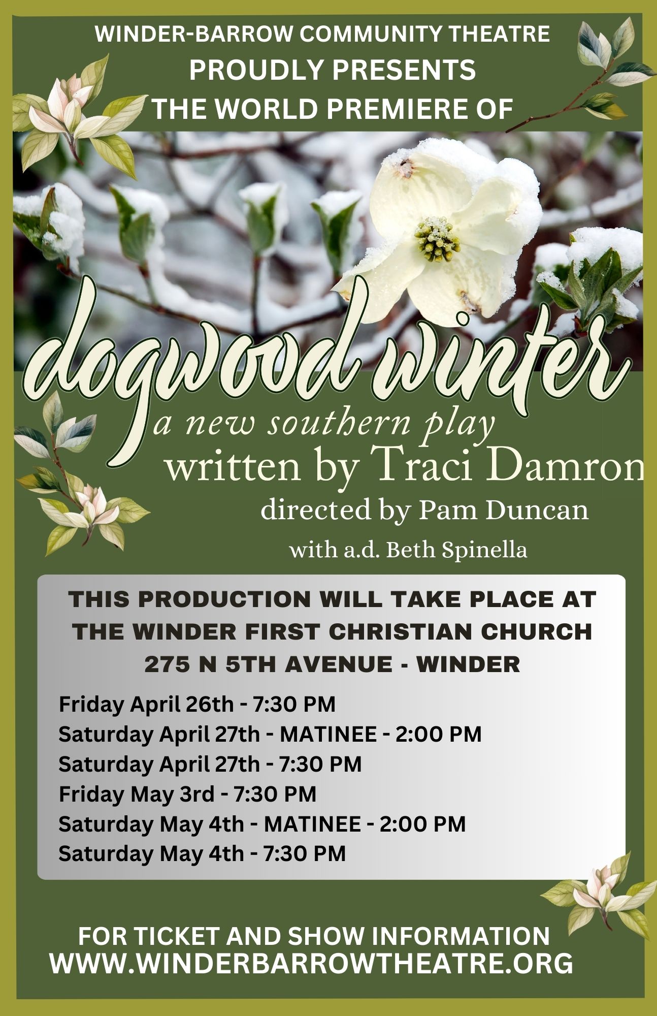 This is the World Premiere production of "Dogwood Winter" by Georgia playwright, Traci Damron. It will be held in the sanctuary of the Winder First Christian Church on Fifth Avenue. It is right across the street from Winder-Barrow High School.